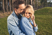 Beztroska nowoczesna młoda kaukaska para stojąca na świeżym powietrzu