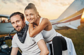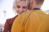 Radosna, piękna, kochająca się młoda para stojąca na zewnątrz.