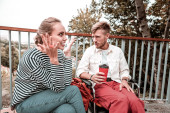 Zadowolony kochający mężczyzna przytula jej uśmiechniętą dziewczynę