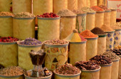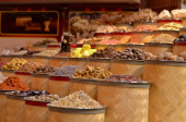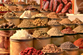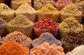 Rzędy i kupy aromatycznych przypraw i ziół na słynnym targu Spice Souk przy ulicy Baniyas, w miejscowości Al Ras, Deira, Dubaj przylegający do Gold Souk podczas Ramazan Kareem. To słynna miejscowość turystyczna.