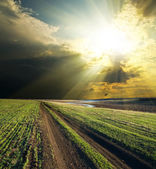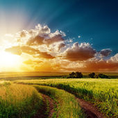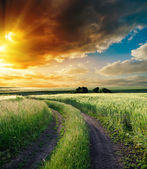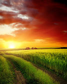 dramatyczny zachód słońca na wiejskiej drodze w zielone pole