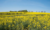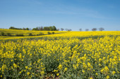 Żółte pole rzepaku z głębokim błękitnym niebem