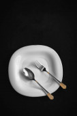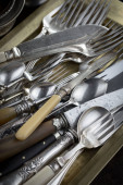 zbliżenie eleganckiego srebrnego sztućca w drewnianym pudełku