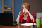 Zdjęcie "Kobieta pracuje zdalnie na laptopie w kuchni. Dziewczyna rozmawia ze swoimi kolegami na internetowej odprawie biznesowej w domu. Dama trzyma szklankę kawy przygotowując się do wykładu na rozmowie wideo." może być wykorzystywane do celów osobistych i komercyjnych zgodnie z warunkami zakupionej licencji Royalty-free. Obraz jest dostępny do pobrania w jakości wysokiej rozdzielczości do 5760x3840.