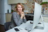 Kobieta pracuje zdalnie na laptopie w kuchni. Poważna dziewczyna robiąca notatki do notesu podczas raportu kolegi na wideokonferencji w domu. Nauczyciel przygotowujący się do wykładu online