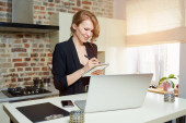 Dama pracuje zdalnie na laptopie w kuchni. Dziewczyna z uśmiechem robiąca notatki do notesu podczas relacji kolegi z wideokonferencji w domu. Nauczyciel przygotowujący się do wykładu.