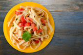 spaghetti na czerwonym talerzu z wegetariańską sałatką widok z góry. pomidory spaghetti, cebula, kapusta na czarnym drewnianym tle