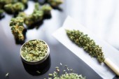 Blunt i Zapalniczki. Zamknij drzwi. Pąki konopi w ręku na czarnym tle Tło dla miejsca Kopiuj. CBD i THC na pączkach konopi indyjskich. Młynek do ziół Świeża marihuana.