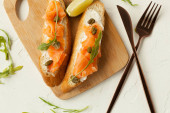 Zdjęcie "Składniki kanapki z łososiem na białym tle. Widok z góry" może być wykorzystywane do celów osobistych i komercyjnych zgodnie z warunkami zakupionej licencji Royalty-free. Obraz jest dostępny do pobrania w jakości wysokiej rozdzielczości do 5760x3840.