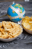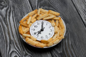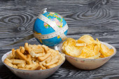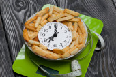 Kubek z krakersami. Zawinięte w taśmę pomiarową. Na szczotkowanych sosnowych deskach. Widok z góry. Symbol Światowego Dnia bez Dietetyki.