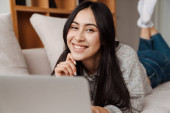 Zdjęcie "Wizerunek czarującej młodej szczęśliwej kobiety korzystającej z laptopa i uśmiechniętej siedzącej na podłodze w salonie" może być wykorzystywane do celów osobistych i komercyjnych zgodnie z warunkami zakupionej licencji Royalty-free. Obraz jest dostępny do pobrania w jakości wysokiej rozdzielczości do 5760x3840.