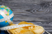 Kubek z krakersami, chipsami i taśmą pomiarową. Na szczotkowanych sosnowych deskach. Symbol Światowego Dnia bez Dietetyki.