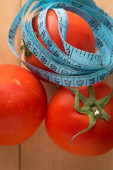 Pęczki pomidorów są na wadze. Blisko taśmy pomiarowej. Na szczotkowanych sosnowych deskach. Symbol Światowego Dnia bez Dietetyki.