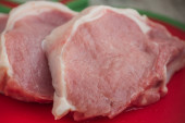 Świeża wołowina. Surowe steki wieprzowe na desce. Kotlety wieprzowe, mięso