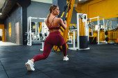 Portret sportowca pięknej sportowca przy użyciu smartwatch podczas treningu w hali sportowej