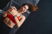 Atrakcyjna młoda wysportowana kobieta stojąca na siłowni, odpoczywająca po ćwiczeniach, opierająca się na szynie