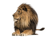 Widok Lwa leżącego, z przodu panthera leo, 10 lat, na białym tle