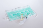rękawice nitrylowe z hydroalkoholową maską chirurgiczną żel i termometr na białym tle