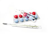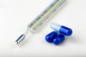 maska chirurgiczna kapsułki lecznicze i termometr na białym tle