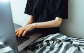 Młoda kobieta siedzi na łóżku i korzysta z laptopa.