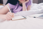 Młoda kobieta leży na łóżku z laptopem i notatnikiem.
