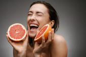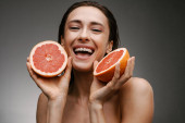 Piękny portret atrakcyjnej uśmiechniętej młodej topless kobiety stojącej odizolowany na białym tle, pokazując plasterki grejpfruta