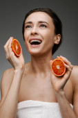 Piękny portret atrakcyjnej uśmiechniętej młodej topless kobiety stojącej na białym tle, pokazując plasterki pomarańczy