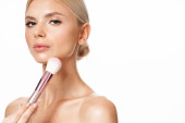 Portret pięknej, półnagiej kobiety nakładającej kosmetyki pędzlem do makijażu na białym tle