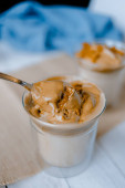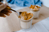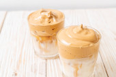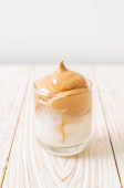 Ręcznie dekoruję kawę dalgonową chrupiącymi kawałkami karmelu. Modna bita kawa rozpuszczalna w Korei