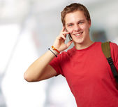 Przystojny młodzieniec w ciemnej kurtce dzwoni na komórkę..