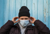 Portret brodatego mężczyzny w masce gazowej. Zapobiegawcza ochrona własnego zdrowia przed infekcją wirusową. Koncepcja koronawiru.