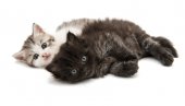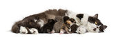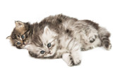 Higland prosto i złożyć kocięta, leżąc razem, patrząc na