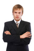 Młody mężczyzna w czarnym garniturze, białej koszuli i krawacie motyl na białym tle