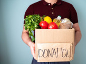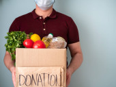 Mężczyzna w niebieskich rękawiczkach trzyma pudełko z jedzeniem i napis DONATION na białym tle. Koncepcja dostarczania i oddawania żywności, niedobory żywności w koronawirusach pandemicznych