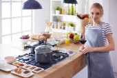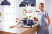 Młoda kobieta stojąca przy biurku w kuchni
