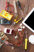 Narzędzia do naprawy telefonów, tabletów i sprzętu elektronicznego z miejscem do kopiowania na drewnianym tle. Widok góry. Układy płaskie