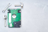 Naprawa urządzeń elektronicznych i obwodów drukowanych. lutowanie i opróżnianie komponentów elektronicznych. Inżynierowie naprawić płytkę obwodu z lutownicy i pistolet na gorące powietrze. Widok z góry