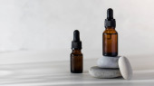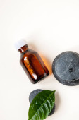 Martwa natura: butelka z pipetą z ciemnego szkła, zielony liść leżący na kamieniach, medycyna naturalna, krople do oczu, krople do nosa