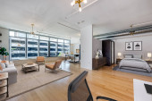 Jasny salon z meblami, takimi jak sofa i stół