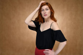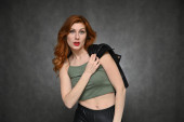 Dziewczyna modelka pozowała w studio na szarym tle. Portret pięknej rudej kobiety w niebieskiej bluzce.