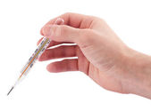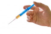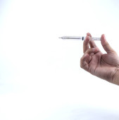 Strzykawka, zastrzyk medyczny w ręku, sprzęt do szczepień z tworzywa sztucznego z igłą wyizolowaną na białym tle. ścieżki wycinania.