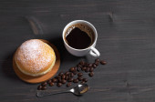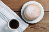 Pączki i filiżanka kawy na drewnianym stole, widok z góry