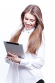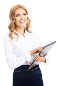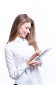 kobieta przy użyciu komputera typu tablet, na białym tle