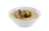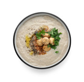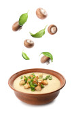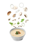 Świeże grzyby, bazylia i papryka wpadające do miski z domowej roboty zupą na białym tle