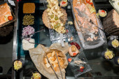 Zdjęcie "Ludzie wokół stołu podczas brunchu w formie bufetu z rąk, wprowadzenie żywności na talerzu. Jedzenie Bufet Catering Jedzenie strony Podział koncepcja. Wyświetlanie restauracji z wieloma daniami kuchni międzynarodowej, różnorodność żywności" może być wykorzystywane do celów osobistych i komercyjnych zgodnie z warunkami zakupionej licencji Royalty-free. Obraz jest dostępny do pobrania w jakości wysokiej rozdzielczości do 5760x3840.