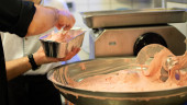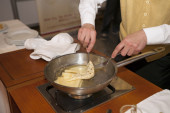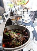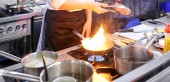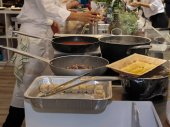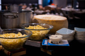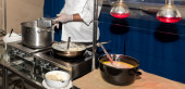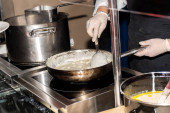 Szef kuchni przygotowuje makaron podczas brunchu w formie bufetu lub blogerów kulinarnych konferencji lub imprezy cateringowej. Stacja makaronowa, gorące jedzenie, świeży makaron. Ręce z rękawiczkami, garnki i talerze na kuchence, piekarnik, gotowanie na żywo