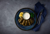 Zdjęcie "Tradycyjne tureckie jedzenie nadziewane liści winogron Dolma, Borek / Burek i Mucver zwany również smażone kulki cukinii z domowej roboty jogurt / jogurt w garnku gliny na drewnianym stole. Żywność ekologiczna." może być wykorzystywane do celów osobistych i komercyjnych zgodnie z warunkami zakupionej licencji Royalty-free. Obraz jest dostępny do pobrania w jakości wysokiej rozdzielczości do 5760x3840.