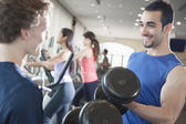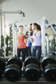 fitness instruktor pomoc dwóch młodych kobiet podnosić ciężary