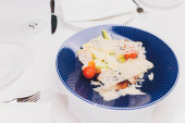 Makaron bavette ze smażonymi krewetkami, sos beszamelowy, liść mięty, czosnek, pomidory, chili na białym talerzu, widok z góry, kuchnia włoska.