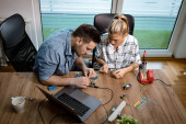 Młoda inżynier skupia się na naprawie sprzętu elektronicznego i sprawdzeniu czegoś na laptopie..